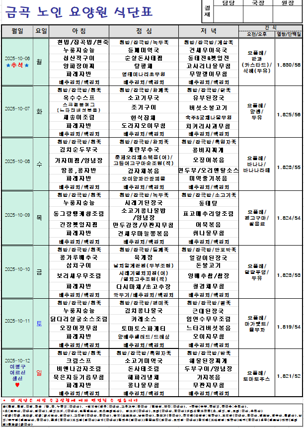 2025년 10월6일~10월12일 주간식단입니다.