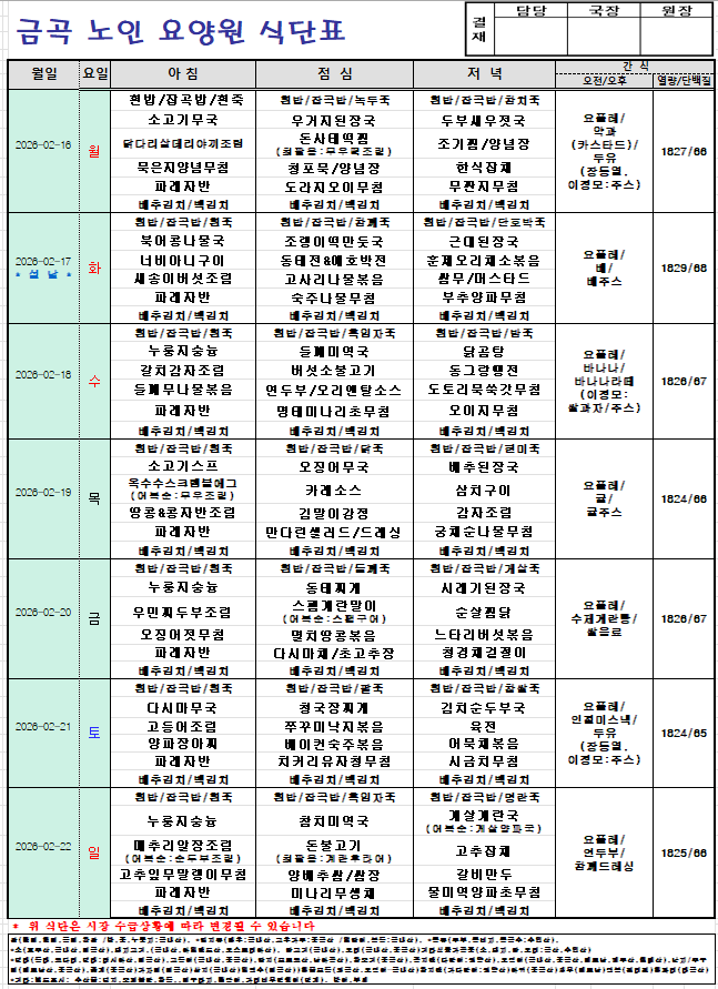 2025년 2월 16일~2월 22일 주간식단입니다.