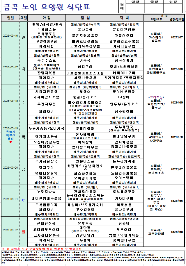 2026년 3월16일~3월22일 주간식단입니다.